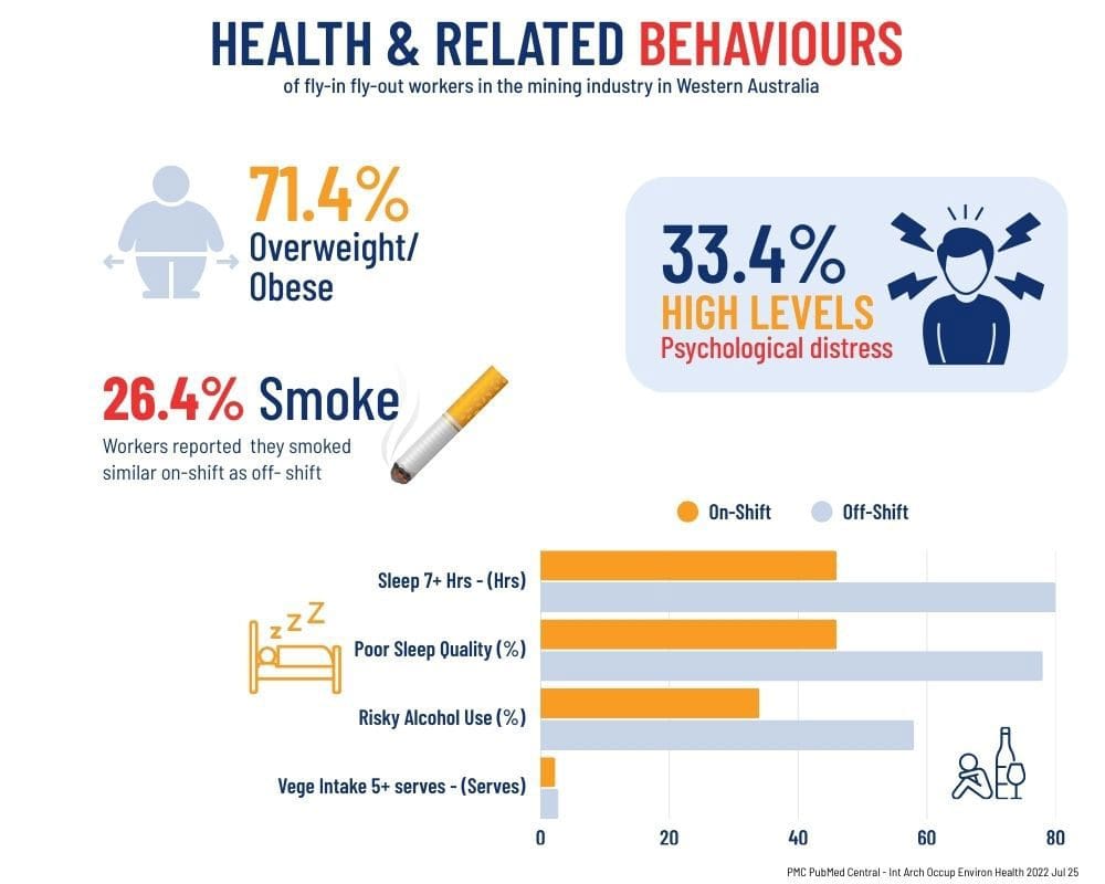 A recent study (2022) shows that physical health outcomes among FIFO workers remain generally positive. While findings show that only 5% of employees report fair or poor health. However, the nature of FIFO and shift work can have a significant impact on worker health. Lifestyle behaviours such as diet, exercise, sleep, and stress management often fluctuate dramatically between on-shift and off-shift periods. These fluctuations can contribute to fatigue, mental health challenges, and long-term physical health risks if not properly managed.